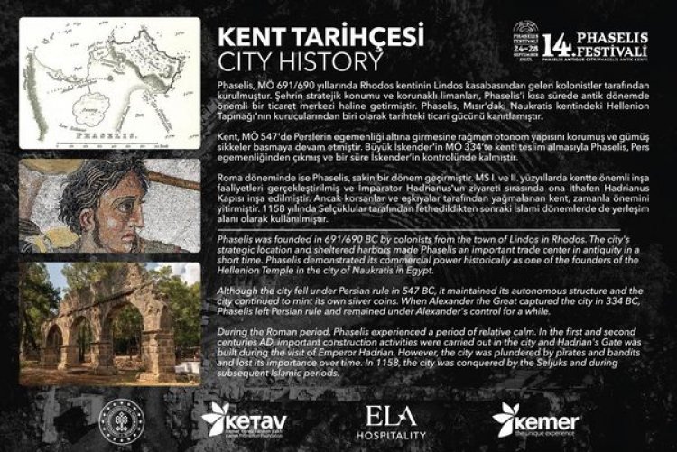 Kültür ve Turizm Bakanlığı, Kemer Kaymakamlığı ve Phaselis Kazı Başkanlığı’nın destekleriyle Kemer ve Yöresi Tanıtım Vakfı (KETAV) tarafından organize edilen Phaselis Festivali, bin yıllık tarihi ile her yıl yüzbinlerce kişinin ziyaret ettiği Phaselis Antik Kenti’nde, 24-28 Eylül tarihleri arasında sanatseverleri ağırlayacak ve tarihle sanatı buluşturacak.
