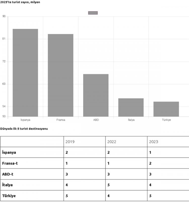 İspanya’nın 85,1 milyonla ilk sırada olduğu 2023’te Fransa 83,2 milyonla onu izledi. Artından gelen ABD 67,2 milyon uluslararası ziyaretçi alırken onu İtalya ve Türkiye izledi.