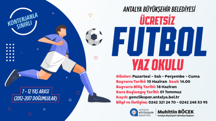 Büyükşehir Belediyesi, yaz tatilini sporla geçirmek isteyen çocuklar için ücretsiz futbol okulu düzenliyor. 7 ile 12 yaş arasındaki her çocuğun katılabileceği futbol kurslarında, çocukların sosyalleşmesinin yanı sıra, futbol branşının uygulamalı öğrenilmesine de yardımcı olunacak. Kontenjanların sınırlı olacağı yaz okulu için 10-18 Haziran tarihleri arasında kayıt başvurusu yapılabilecek. Kayıt için genclikspor.antalya.bel.tr adresinden veya 0242 321 2470 numaralı telefondan bilgi alınabilir. Futbol yaz okulu 1 Temmuz’da başlayacak.