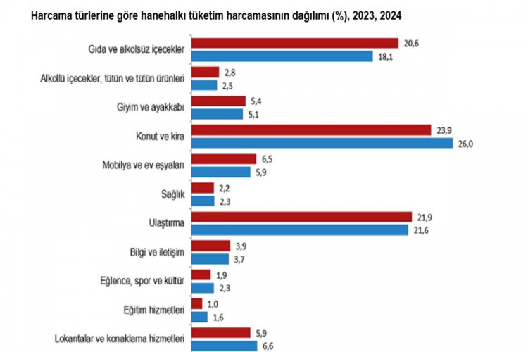 Hanehalkı tüketim harcamasının türlerine göre dağılımında ise TEK KİŞİLİK HANEHALKI HARCAMASININ % 8,5’i otel ve lokantalardan oluştu. Bu oran en yüksek; çekirdek aile bulunmayan birden fazla kişinin olduğu gruplerde % 12,1 ile en yüksek. Eşler ve çocuklardan hanelerde % 6,4 oldu.