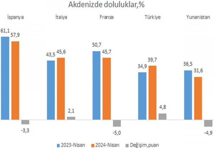 2024 yılı Nisan ayında Akdeniz’de en yüksek net otel dolulukları % 58 ile İspanya’da kaydedildi. Onu % 46 ortalamalarla İtalya ve Fransa izledi. Türkiye % 39 ile yükseldi.