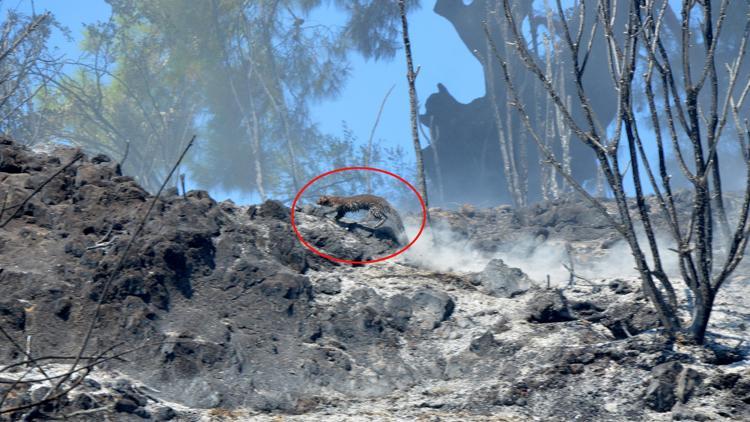 Yanan alanda, köz ve küllerin arasından kaçmaya çalışan sansar kameralara yansıdı. Jandarma yangınla ilgili inceleme başlattı. (DHA)
