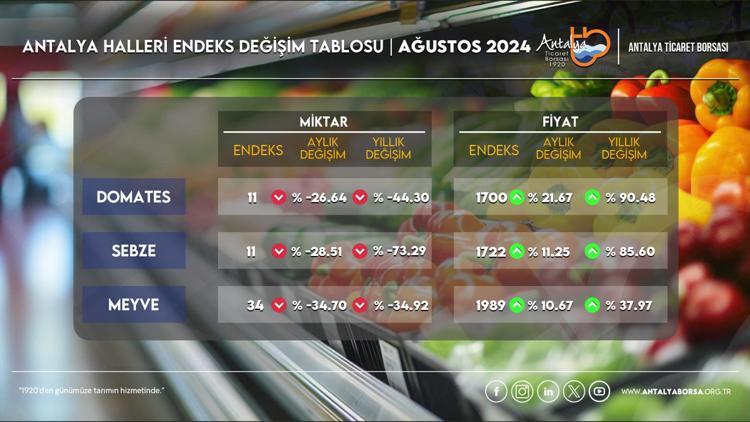 Ağustos ayı endeksleri miktarda bir önceki aya göre (aylık) domateste yüzde 26.64, sebzede yüzde 28.51, meyvede ise yüzde 34.70 azaldı. Miktar endeksleri geçen yılın aynı ayına göre (yıllık) domateste yüzde 44.30, sebzede yüzde 73.29 ve meyvede ise yüzde 34.92 azaldı. Ağustos ayında endekslerdeki yıllık değişimler, miktarda domates, sebze ve meyve için 9 yıllık ortalamanın altında kalırken, yıllık fiyat endekslerindeki değişimler domates, sebze ve meyve için ortalama üstünde gerçekleşti.