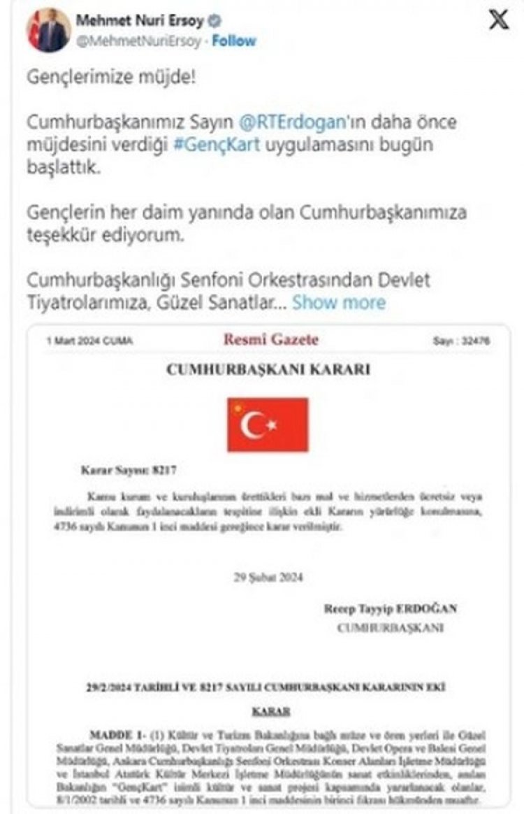 Bakan Ersoy, Sosyal medya hesabından yaptığı paylaşımda GençKart uygulaması ile sanatsal etkinliklerden ücretsiz ya da indirimli faydalanma imkanı sağlayan Cumhurbaşkanı Kararı’nın, Resmi Gazete’de yayımlanmasından dolayı Cumhurbaşkanı Recep Tayyip Erdoğan‘a teşekkür etti.