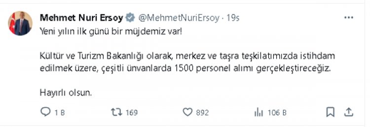 Bakan Mehmet Nuri Ersoy, sosyal medya hesabından,yaptığı açıklamada “Yeni yılın ilk günü bir müjdemiz var.” dedi ve Kültür ve Turizm Bakanlığı olarak, merkez ve taşra teşkilatında istihdam edilmek üzere, çeşitli ünvanlarda 1500 personel alımı gerçekleştireceklerini ifade etti.
