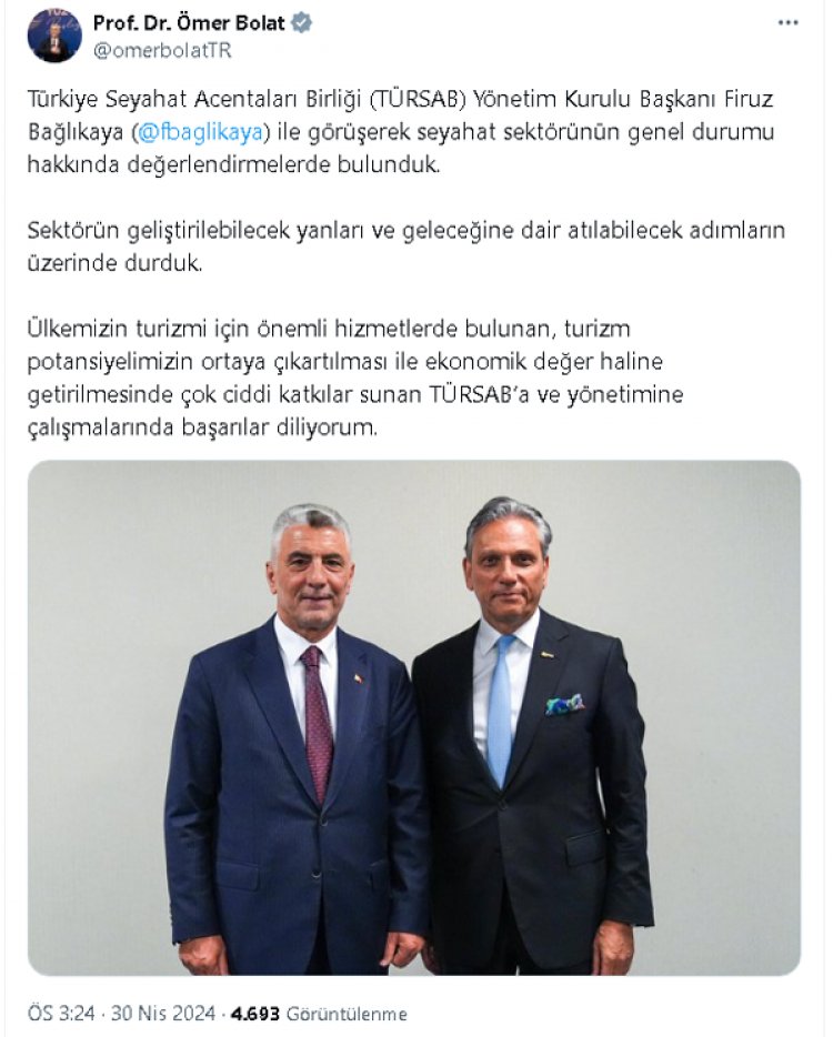 Görüşmeye ilişkin sosyal medya hesabından paylaşım yapan Bakan Bolat, “Ülkemizin turizmi için önemli hizmetlerde bulunan, turizm potansiyelimizin ortaya çıkartılması ile ekonomik değer haline getirilmesinde çok ciddi katkılar sunan TÜRSAB’a ve yönetimine çalışmalarında başarılar diliyorum” dedi.