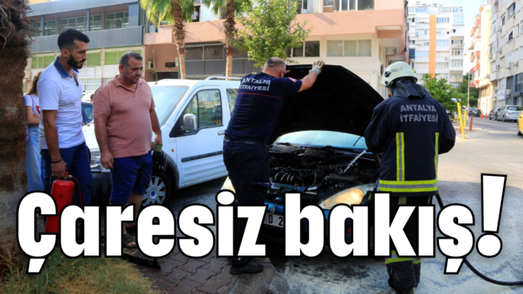 Olay, dün saat 16.30 sıralarında Antalya’nın Muratpaşa ilçesi Altındağ Mahallesi 159 sokak üzerinde meydana geldi. Park halindeki 42 D 2788 plakalı aracın motor kısmından dumanlar çıktığını gören vatandaşlar 112 Acil Çağrı Merkezini arayarak durumu bildirdi. İhbarla olay yerine polis ve itfaiye ekipleri sevk edilirken, sokak üzerinde bulunan esnaf ve vatandaşlar ellerine aldıkları su kovaları ve yangın tüpleri ile araca müdahale etmeye çalıştı. Kısa sürede olay yerine gelen itfaiye ekibinin müdahalesi ile yangın kısa sürede söndürüldü. İtfaiye ekibinin araca müdahalesi sırasında araç sahibi aracı park ettiği yere geldi. Kısa sürede önce park ettiği aracının motor kısmının yandığını gören Şemsettin Akyüz isimli vatandaş neye uğradığını şaşırdı.