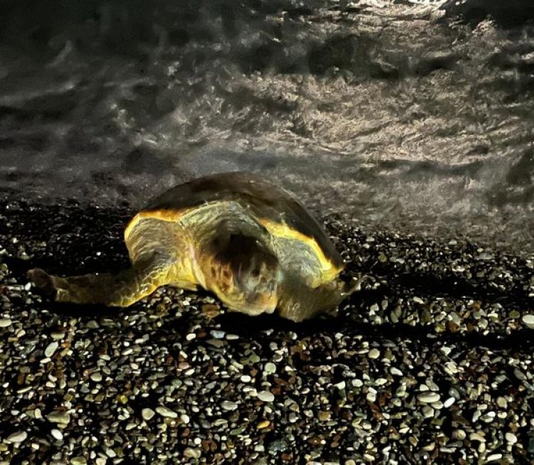 Nesli tükenme tehlikesi altında bulunan dev caretta caretta türü deniz kaplumbağası, gece geç saatlerde sahile çıktı.
