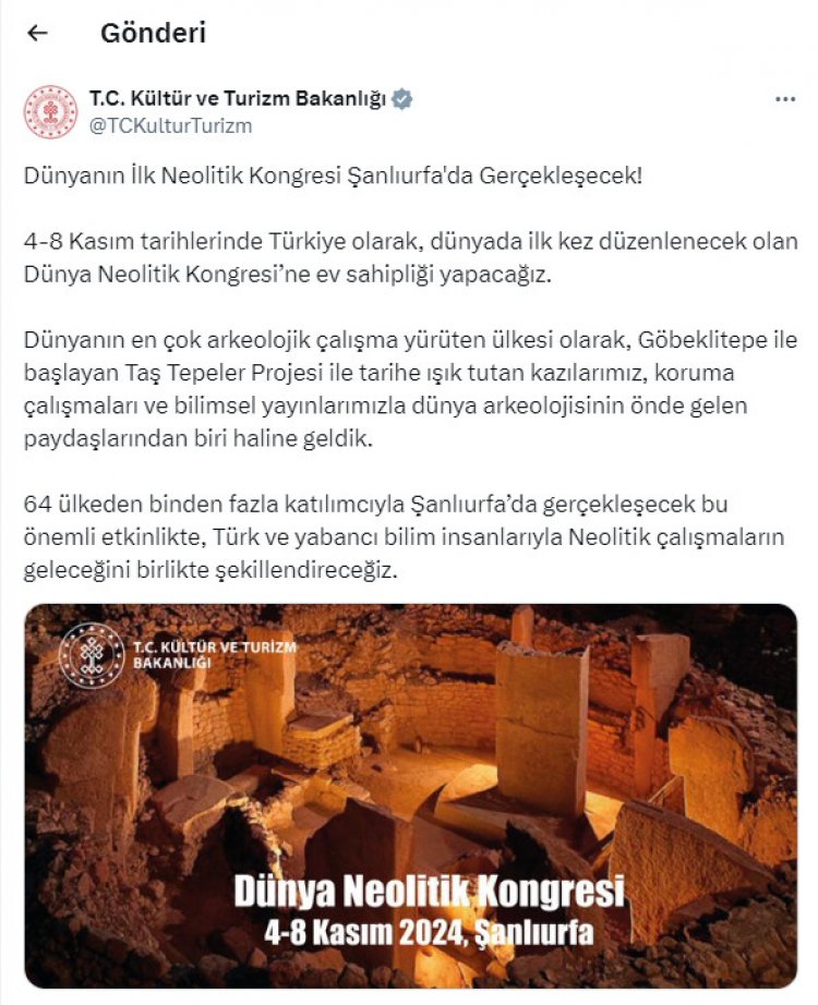 “Dünyanın en çok arkeolojik çalışma yürüten ülkesi olarak, Göbeklitepe ile başlayan Taş Tepeler Projesi ile tarihe ışık tutan kazılarımız, koruma çalışmaları ve bilimsel yayınlarımızla dünya arkeolojisinin önde gelen paydaşlarından biri haline geldik.64 ülkeden binden fazla katılımcıyla Şanlıurfa’da gerçekleşecek bu önemli etkinlikte, Türk ve yabancı bilim insanlarıyla Neolitik çalışmaların geleceğini birlikte şekillendireceğiz.”