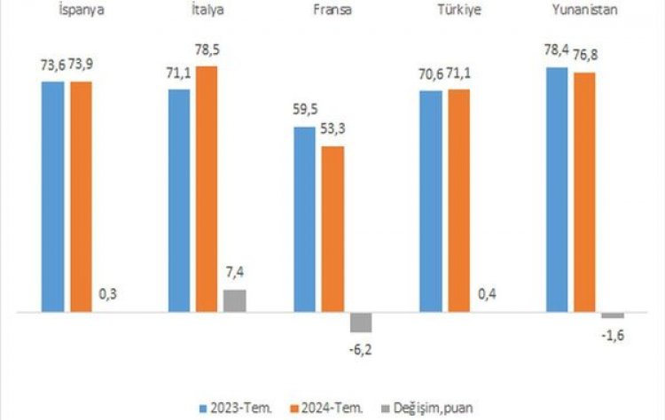 Akdeniz’de Temmuz 2024’te en yüksek net otel dolulukları % 79 ile İtalya’da kaydedildi. Onu % 77 dolayında düzeyle Yunanistan ve % 74 ile İspanya izledi. Türkiye % 71’e ulaşırken Fransa dışında geçen yıla göre doluluklar arttı.