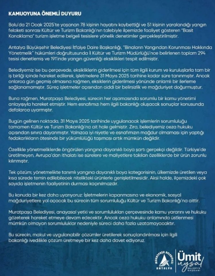 Muratpaşa Belediyesi’nin açıklamasında, işletmelerin kapanmasına ve ekonomik, sosyal mağduriyetlere yol açacak bu sürecin tüm sorumluluğunun Kültür ve Turizm Bakanlığı’na ait olduğu bir kez daha yinelendi. Belediyenin, anayasal yetki ve sorumlulukları çerçevesinde kamu yararını ve hukuku gözeterek hareket etmeye devam edeceği ancak ceza hukuku anlamında üstlenmesi mümkün olmayan sorumluluklar nedeniyle süreci daha fazla uzatamayacağı belirtildi.