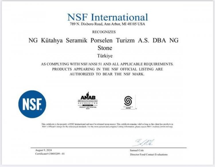 NG Kütahya Seramik, NSF sertifikasını dünyada sadece birkaç ülkede üretilebilen 160×320 ebatlarındaki dünyanın en büyük seramiklerinden oluşan NG Stone serisi ürünleriyle aldı. NSF sertifikası dünyada, tasarım, hijyen, sağlık, güvenirlilik ve yüksek kalite standartlarını karşılayan ürün ve markalara veriliyor.
