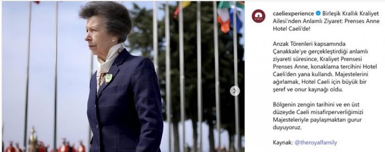Ziyaret boyunca Ecebat İlçesi Komköy’de bulunan Hotel Caeli’de ağırlanan Prenses Anne, hem Çanakkale’nin tarihi dokusunu hem de otelin sunduğu üst düzey konforu deneyimledi. Otel yönetimi, sosyal medya hesapları üzerinden yaptığı açıklamada şu ifadelere yer verdi: