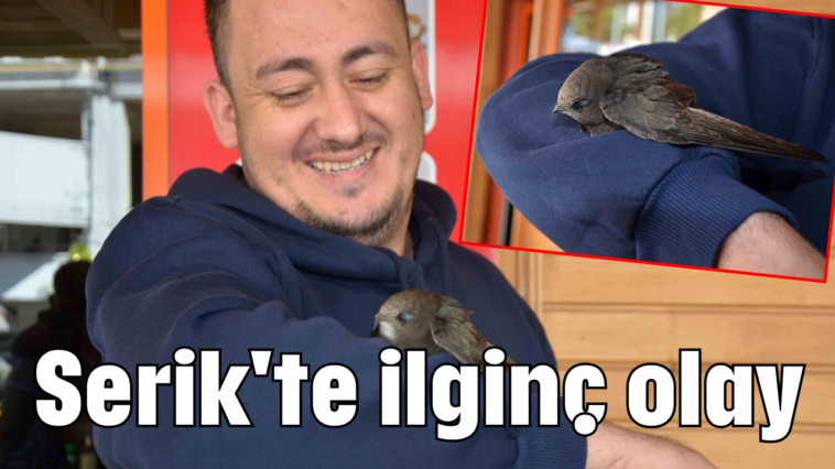 Serik’te emlakçı Mevlüt Aslan, sabah geldiği iş yerine giren ebabilin bitkin halde durduğunu fark etti. Mevlüt Aslan’ın doğaya bırakmak istediği kuş koluna konduktan sonra ayrılmadı. Aslan, kolunda kuşla veterinere gitti. Ebabil, veteriner hekimin müdahalesi sonrası Aslan’ın kolundan ayrıldı. Ebabil daha sonra Antalya Doğa Koruma ve Milli Parklar Müdürlüğü ekiplerine teslim edildi.
