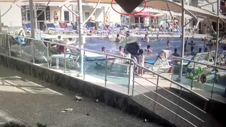 Olay, otelin güvenlik kamerasına da yansıdı. Görüntülerde; havuz kenarındaki şezlongda oturan Orakcı’nın üzerine baca kapağının düştüğü anlar yer aldı. Sezlongun yanındaki çocuğun kıl payı kurtulduğu kazada, Orakcı’ya diğer tatilcilerin ve sağlık personelinin yardım ettiği anlar da kaydedildi. (DHA)