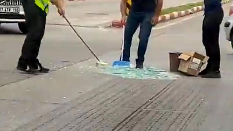 Diğer araçların zarar görmemesi ve trafik akışını sağlamak için cadde üzerindeki bir esnaf süpürge ve kürek getirdi. Trafik polisi süpürürken, esnaf da kürekle cam kırıklarını toplayıp, bir kutuya koyduktan sonra çöpe attı ve trafik akışı kısa zamanda sağlandı.