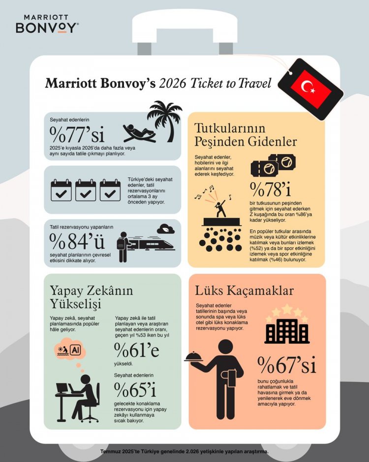 Türkiye genelinde 2.026 yetişkinle gerçekleştirilen Marriott Bonvoy’un 2026 Ticket to Travel Raporu’na göre, Türkiye’deki seyahat edenlerin %77’si 2026 yılında 2025’e kıyasla daha fazla ya da aynı sayıda tatile çıkmayı planlıyor. Katılımcıların %42’si ise tatil sayısını artırmayı hedefliyor.