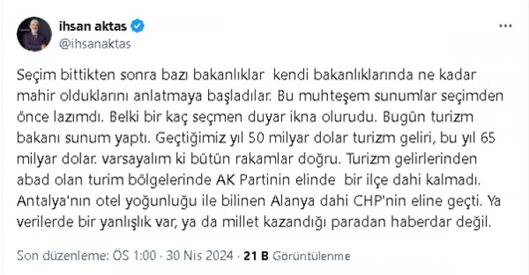 İhsan Aktaş yaptığı açıklamasında, ” Seçim bittikten sonra bazı bakanlıklar kendi bakanlıklarında ne kadar mahir olduklarını anlatmaya başladılar. Bu muhteşem sunumlar seçimden önce lazımdı. Belki bir kaç seçmen duyar ikna olurudu. Bugün turizm bakanı sunum yaptı. Geçtiğimiz yıl 50 milyar dolar turizm geliri, bu yıl 65 milyar dolar. varsayalım ki bütün rakamlar doğru. Turizm gelirlerinden abad olan turim bölgelerinde AK Partinin elinde bir ilçe dahi kalmadı. Antalya’nın otel yoğunluğu ile bilinen Alanya dahi CHP’nin eline geçti. Ya verilerde bir yanlışlık var, ya da millet kazandığı paradan haberdar değil.”dedi.