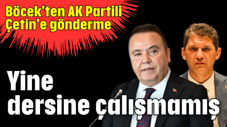 Antalya Büyükşehir Belediye Başkanı Muhittin Böcek, sosyal medya hesabından yaptığı paylaşımda, düzenlediği basın toplantısında kendisini eleştirip, “Proje, vizyon ve hizmet yok” diyen AK Parti Antalya İl Başkanı Ali Çetin’e “Yine dersine çalışmamış, Antalya ve hizmetlerimizden bihaber” şeklinde göndermede bulundu. Böcek, sosyal medya hesabından şu paylaşımı yaptı: